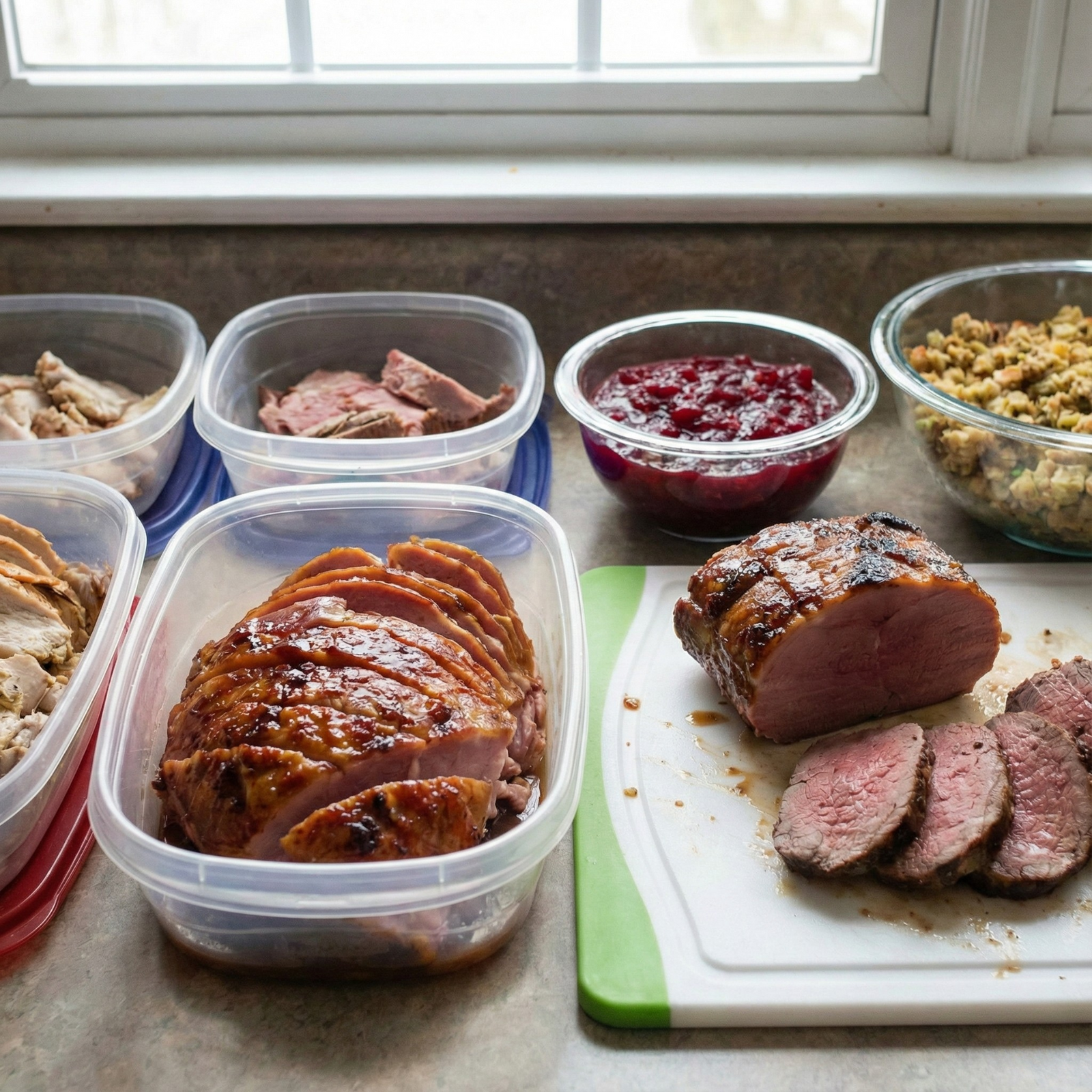 Post-holiday leftover meat guide with fridge storage timelines, thawing guidance, and reheating tips to keep meat safe, juicy, and not overcooked.